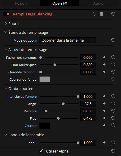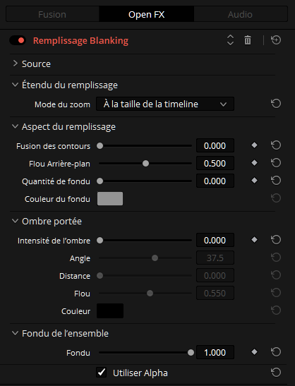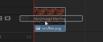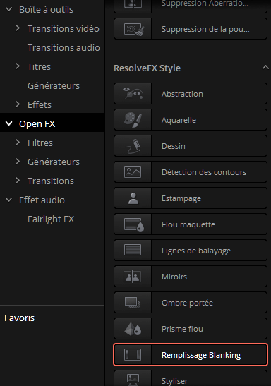 Une fois placée sur la ligne de temps, on va rechercher l’effet visuel adapté dans la partie Effets ResolveFX Style. Il se nomme « Remplissage Blanking ».