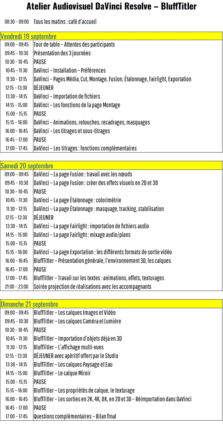 Grâce à un prix de participation très ajusté, je donne l’occasion, au plus grand nombre d’entre vous, d’accéder à une formation complète sur le montage audiovisuel haut de gamme au cours de ces 3 jours sur 2 logiciels entièrement complémentaires.