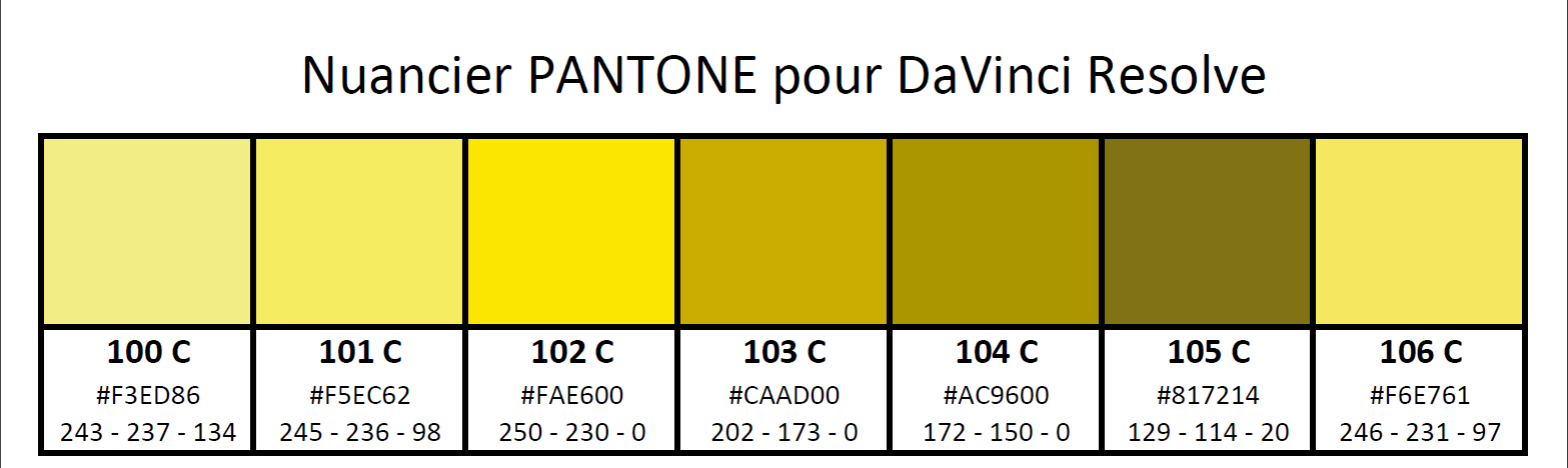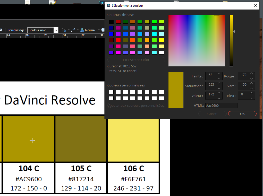 Pour l’utiliser en mode sélecteur de couleur, afficher la page contenant la couleur puis superposer la pipette de la fonction DaVinci Resolve sur cette couleur. La concordance est parfaite avec la composition RVB du nuancier comme le montre la capture ci-dessous.