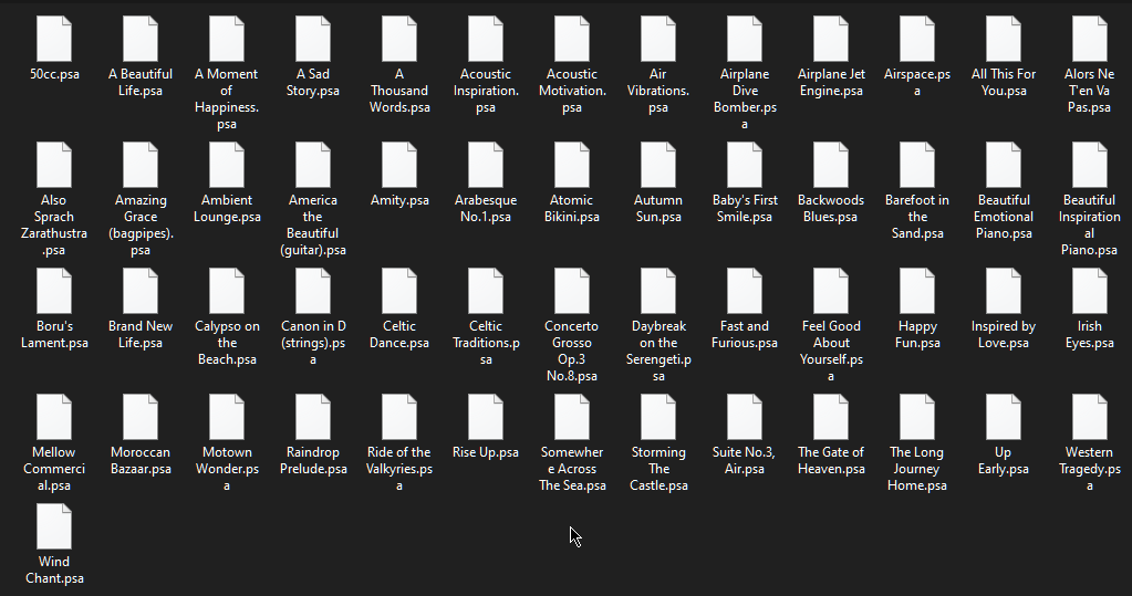 Pack de 53 musiques au format original .psa converties en .wav. Format .psa également inclus.