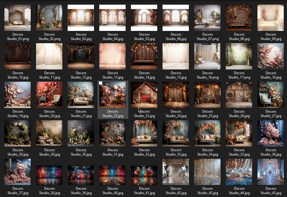 Collection de 45 décors de studio idéals pour incruster des séances de portraits (mariages, fiançailles, famille, …)