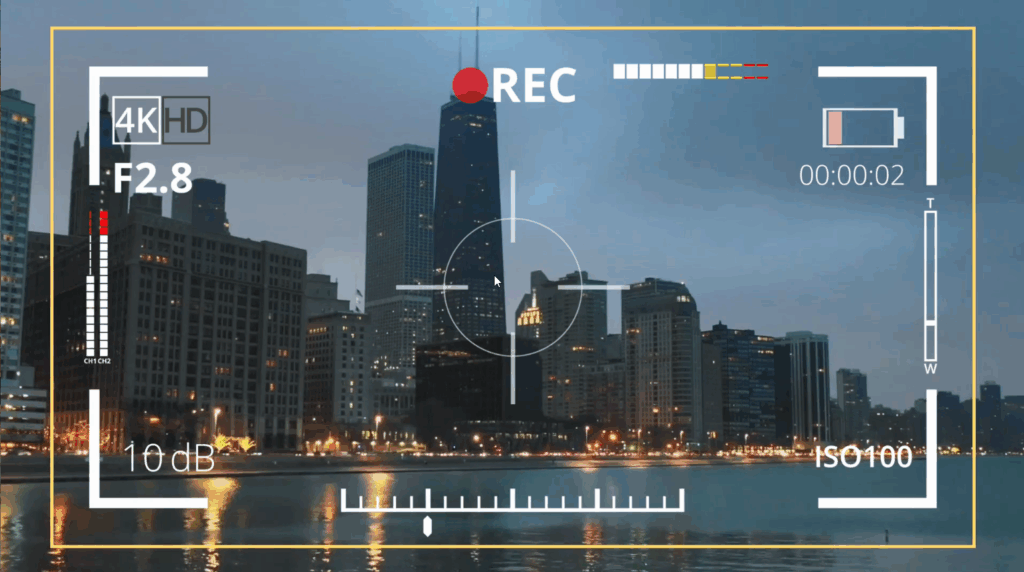 Intégrer les éléments présents dans un viseur de caméra ou d’appareil photo est l’objet de ce pack comprenant 60 objets individuels comme le cadre, le niveau de batterie, la résolution, le signe d’enregistrement, la valeur ISO, le niveau audio, l’ouverture … Tous ces éléments sont paramétrables : position, taille couleur, durée d’animation … pour obtenir par exemple cette vue dans un montage.