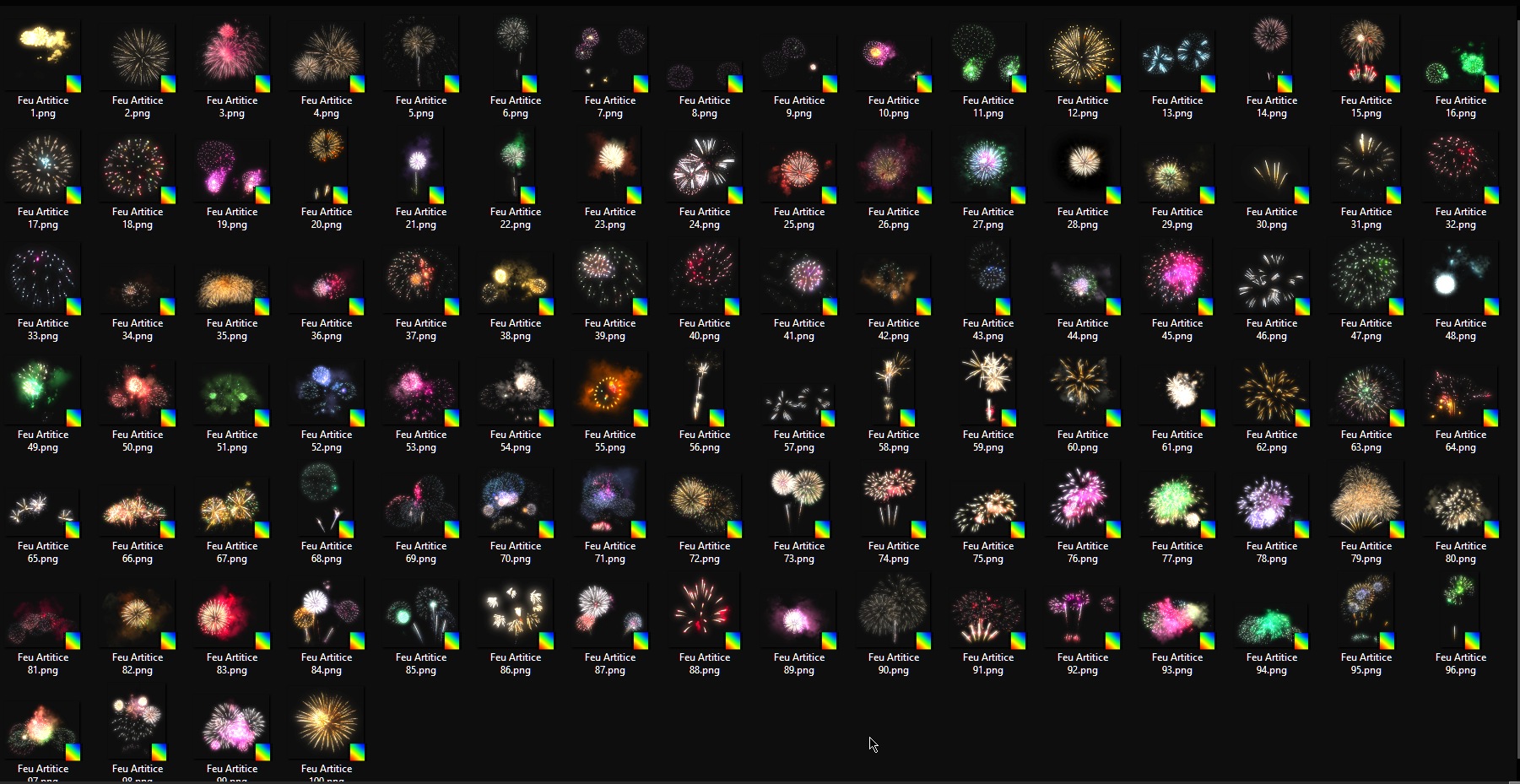 - 100 fichiers PNG avec transparence de feux d’artifice incrustables sur toute image.