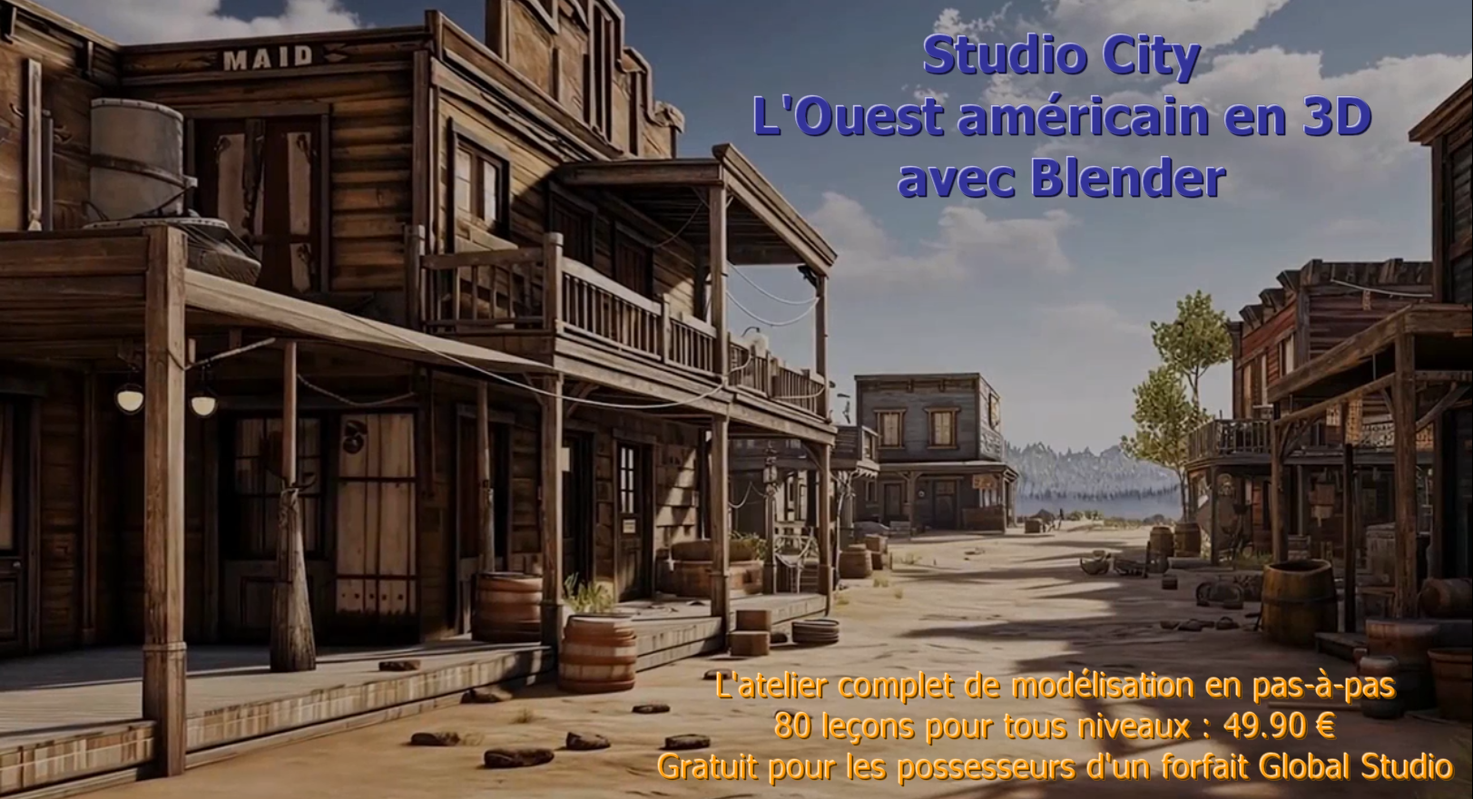 Il est basé sur le logiciel gratuit Blender et vous permettra de créer une scène de rue d’une ville imaginaire de l’Ouest américain. Cette scène sera exploitable, à votre guise, dans BluffTitler ou DaVinci Resolve.